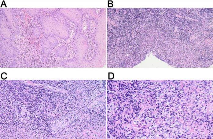 图3 扁桃体肿块的代表性HE染色图像。(A)病变周围假上皮瘤样增生,放大100倍;(B) 放大100倍,大量坏死和血管增生;(C) 肿瘤细胞小病灶分布在坏死背景和侵犯血管中,放大200倍;(D) 放大400倍,肿瘤细胞具有中等半透明的细胞质和不规则扭曲的细胞核