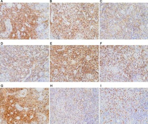 图4 扁桃体肿块的免疫组织化学结果。肿瘤细胞对CD2(A)、CD3(B)、CD4(C)、CD5(D)、CD7(E)、CD8(F)、颗粒酶B(G)和TIA-1(H)呈阳性。一、Ki-67表达。在200倍的放大倍数下观察图像