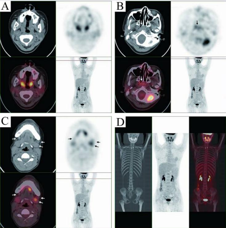 图6 正电子发射断层扫描/计算机断层扫描(PET/CT)显示喉部(A)、上颌(B)和颌下腺(C)有浸润。(D) 未发现明显远处转移