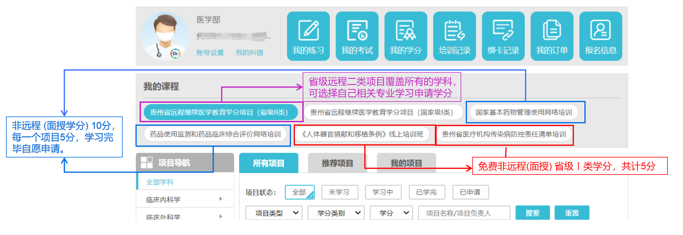 特别提醒,完成学习及考试后一定要点击“申请学分”,请确保医博士的信息(证件号、姓名等)与继教通信息一致。
