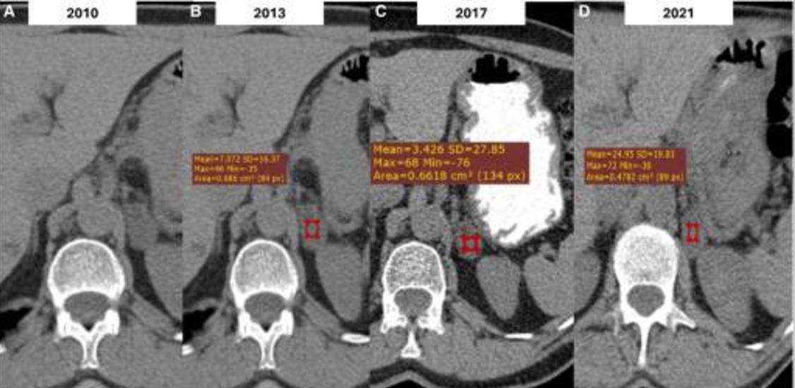 2010年,一名有高血压病史的64岁男性吸烟者因腹部不适进行腹部CT检查后,被偶然诊断出左肾上腺有3厘米的同质病变。病变密度<10HU,因此倾向于ACA。激素检查显示没有激素分泌过多的证据。患者在前3年每年接受腹部CT,然后每2年随访一次。病变的大小和影像学特征一直保持稳定,直到2017年失访。