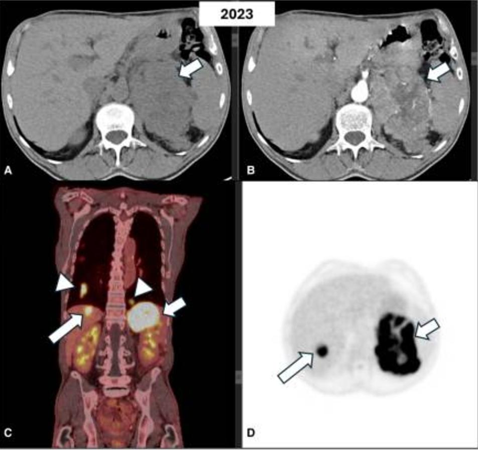 2021年进行的CT扫描显示,病变稳定,为3cm,但非增强衰减值较高,为24HU(图1)。激素筛查显示没有激素分泌过多。2年后,患者在3个月内体重明显减轻,伴有疲劳和腹痛。腹部CT显示,左侧肾上腺存在12×11.5×8.6 cm的异质性病变,表现为周围结构弥漫性浸润(图2)。