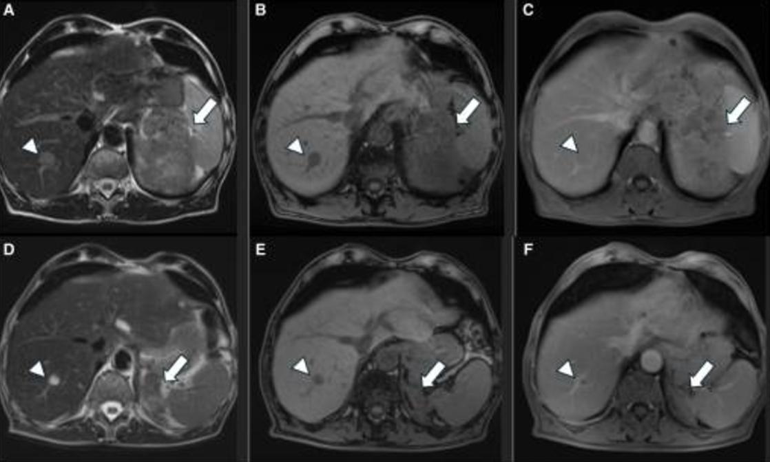 图3 同一患者治疗前和治疗后6个月的MRI。治疗前轴向T2W STIR(A)、T1反相(B)和对比增强T1W SPIR(C)图像显示,左侧肾上腺存在异质性肿块(A和B中的箭头),并具有强烈的对比增强(C中的箭头。右肝叶也可见肝转移(A-C中的箭头)。相应的治疗后MRI显示肾上腺病变大小显著减小(D-F中的箭头)。注意对比后图像上病变的最小增强(F中的箭头),这是肿瘤对治疗反应的另一个发现。在治疗后MRI上,肝脏病变也减少(D和E中的箭头),增强程度较低(F中的箭头)