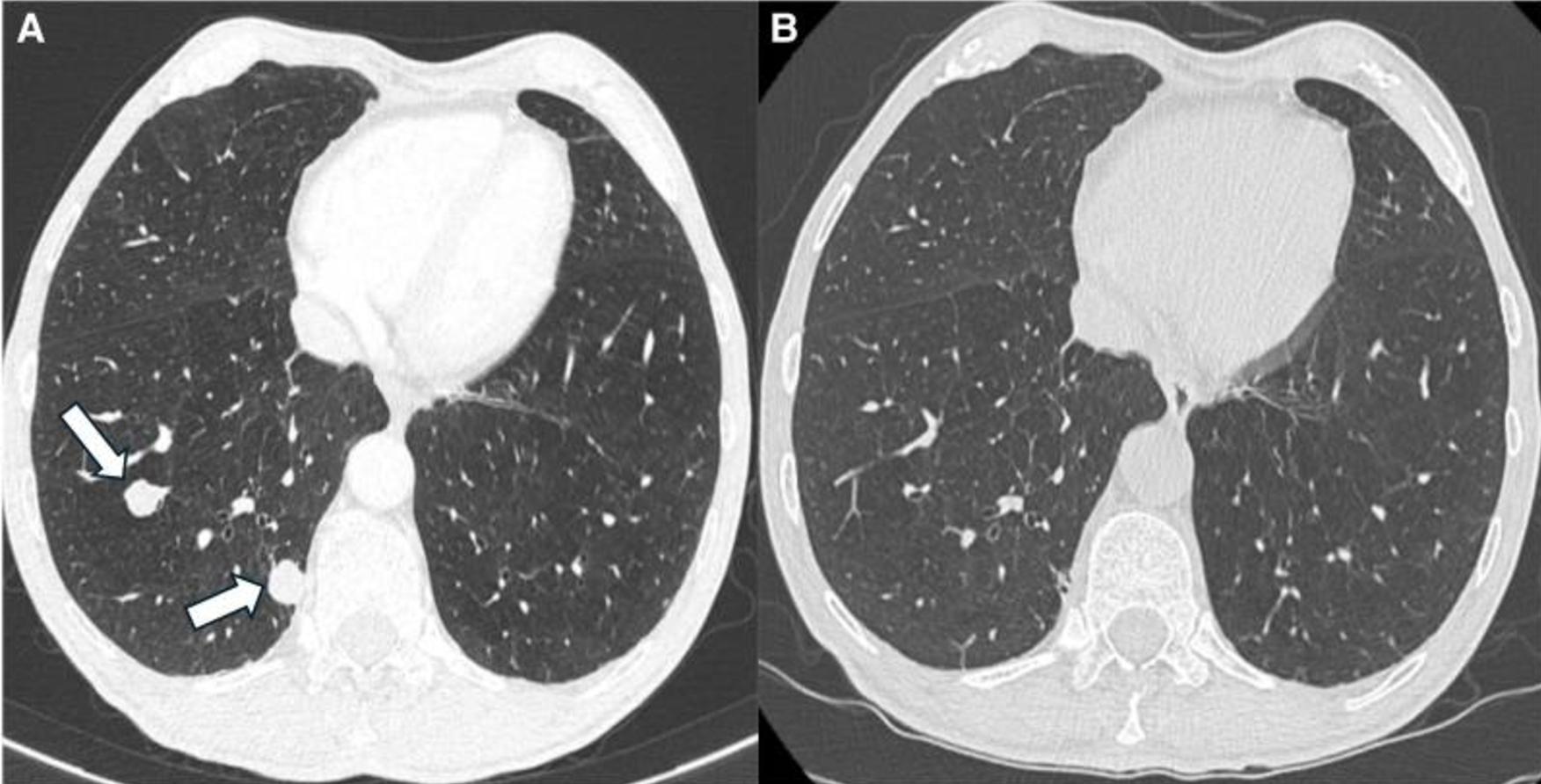 图4 患者治疗前后肺部CT。初始表现(A)的轴位CT图像显示右下叶有2个边界清晰的肺结节(箭头),与转移一致。治疗6个月后,相同水平(B)的相应CT图像显示转移结节完全消退