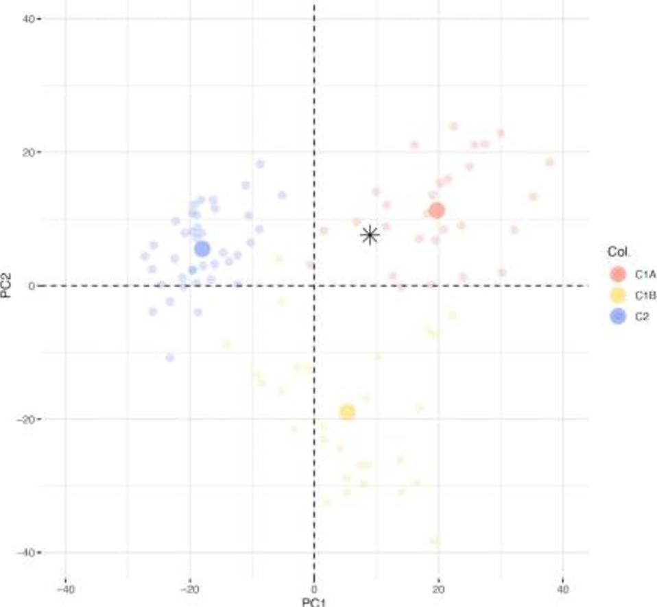 图5 转录组分类。在95名患者的参考队列中,将患者样本(*)投影到主成分分析(PCA)的两个主成分(Dim1、Dim2)上。来自该参考队列的样本以转录组类别着色的淡圆圈表示:蓝色表示肾上腺皮质腺瘤“C2”,红色表示预后不良的肾上腺皮质癌“C1A”,黄色表示预后较好的肾上腺皮质癌“C1B”