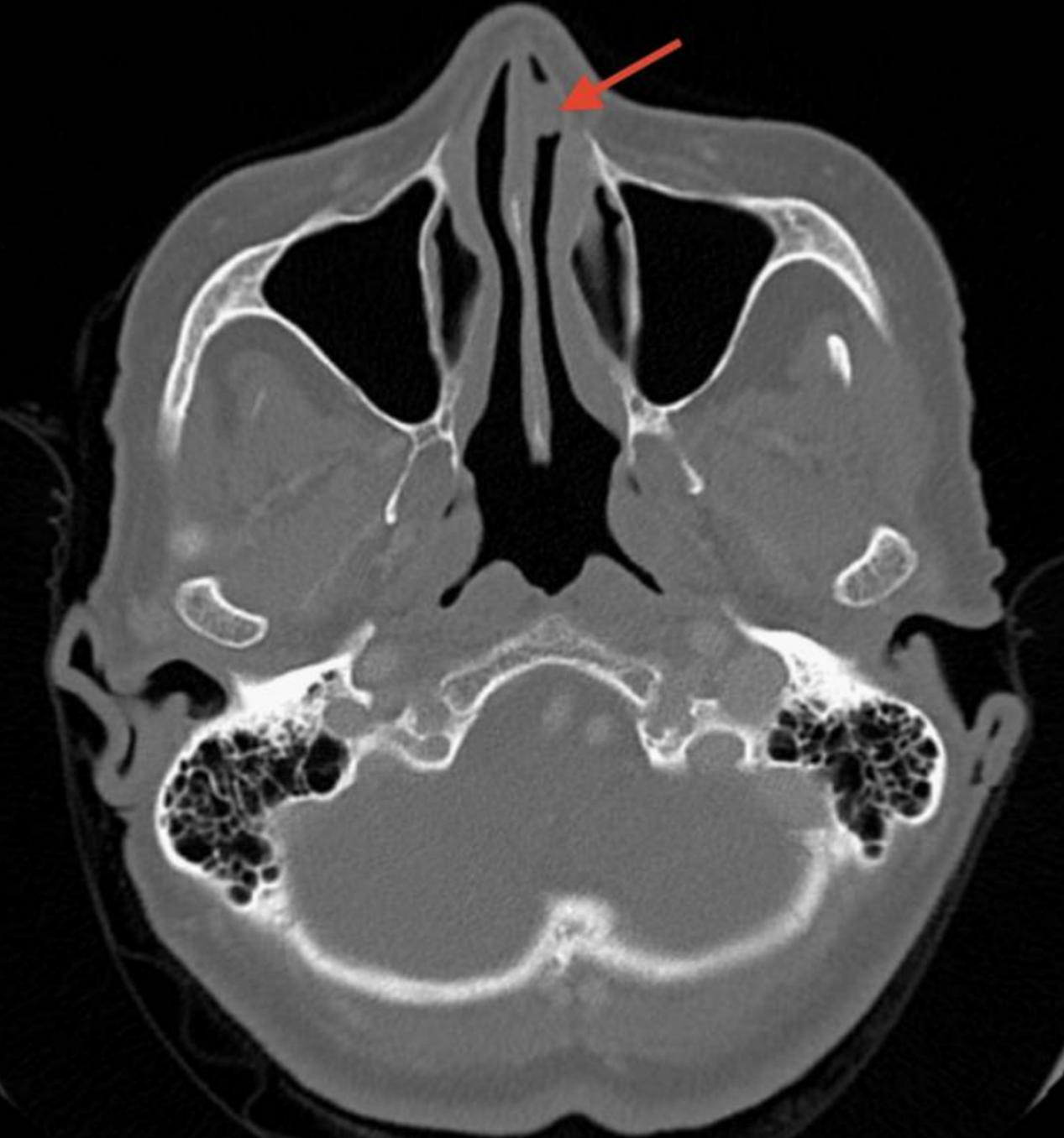 患者主诉左鼻孔出现鼻部不适,鼻腔通畅性降低,给药后(0.03%异丙托溴铵和生理盐水喷雾)从左鼻孔流出。鼻镜和CT扫描显示,左鼻孔内鼻前庭顶部有一个8x8毫米的肉质肿块(图1)。