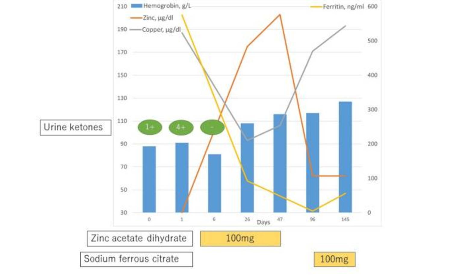 由于血清锌水平显著降低(30μg/dL;正常65-110),予患者口服100mg/天的醋酸锌。第6天,患者尿酮呈阴性,厌食症也有所改善,因此停止了抗感染治疗。骨密度和生长正常。所有症状均已缓解后,在入院第七天出院。患者为学生,为节省时间只进食糕点及牛奶,建议均衡饮食,重点是海鲜和肉类。第23天,血清血红蛋白升高到103g/L,锌水平升高到175μg/dL。第47天停用醋酸锌。第96天,患者血清铁蛋白水平降至4.7ng/mL,因此我们给她服用了100 mg/天的柠檬酸亚铁钠。所有实验室异常情况都有所改善,感觉注意力更好。目前的定期随访没有复发(图1)。