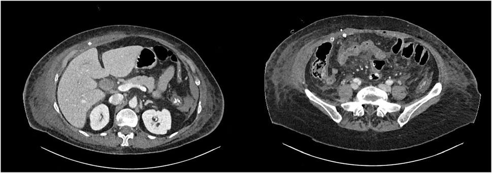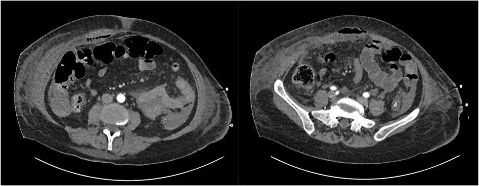 入院后第10天,出现右腹部发热和肿胀。右腹部触诊时出现疼痛和腹部防护。血液检查显示急性期反应物,CT显示存在局部气腹,右侧肌后(直肠后)间隙有广泛的脓肿,达到肋骨水平,腹膜前受累,所有这些都与延迟空肠穿孔和肌后间隙瘘口有关(图1)。