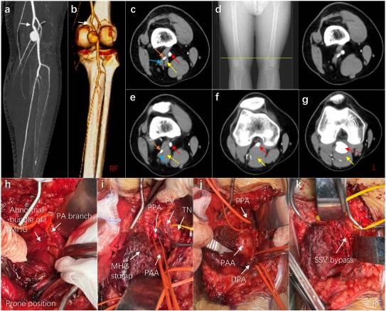 图1 PAES患者在诊断和治疗过程中的图像。(a,b)计算机断层血管造影(CTA)显示的右腘动脉(PA)动脉瘤。PA狭窄用白色箭头表示。(c-g)轴位图像显示异常肌束和腘动脉瘤(PAA)。d中的黄线显示了该肌束起源于股骨内侧髁上方的位置。红色箭头表示PA。黄色箭头表示腓肠肌(MHGM)的内侧头,其中虚线表示异常的肌束。橙色箭头显示PA的分支。蓝色箭头显示腘静脉(PV)。(h-k)术中照片显示MHG、近端PA(PPA)、远端PA(DPA)、PV、胫神经(TN)和小隐静脉(SSV)的异常束