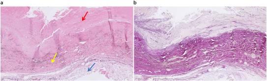图2 病理检查结果的代表性图像。(a) 腘动脉假性动脉瘤血管壁苏木精伊红染色;红色箭头表示附壁血栓,黄色箭头表示纤维结缔组织出现透明变性和含铁血黄素沉着症,蓝色箭头表示蜂窝组织。(b) 维多利亚蓝法对弹性纤维染色显示阴性结果