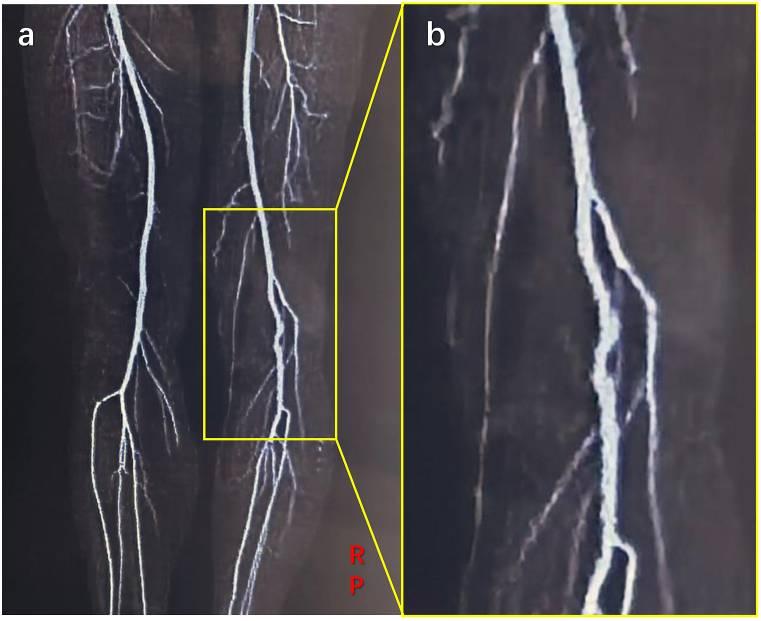 图3 术后4个月的CTA图像。(a-b)血管造影结果显示右腘动脉血流通畅