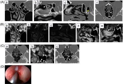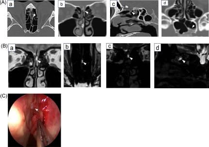 C内窥镜检查。观察到左上鼻甲和鼻中隔之间的脑膜膨出(箭头)。瘘管的尺寸约为1-2mm。CT、计算机断层扫描;CSF,脑脊液;MRI、磁共振成像;T2加权成像;3D、三维。