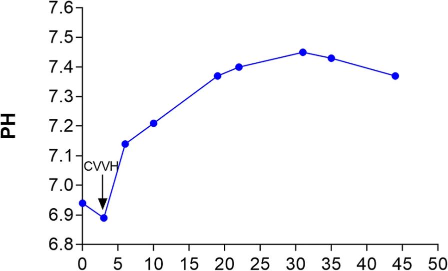 图1 患者转入ICU后44小时内动脉pH值的变化。在开始连续静脉-静脉血液透析滤过(CVVH)后,患者的代谢性酸中毒迅速改善。箭头表示CVVH的启动时间