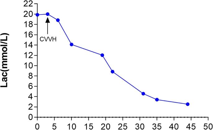 图2 患者转入ICU后44小时内动脉乳酸(Lac)的变化。入院时,血乳酸高于检测水平(最高20 mmol/L)。在开始连续静脉-静脉血液透析滤过(CVVH)后,患者的代谢性酸中毒迅速改善。箭头表示CVVH的启动时间