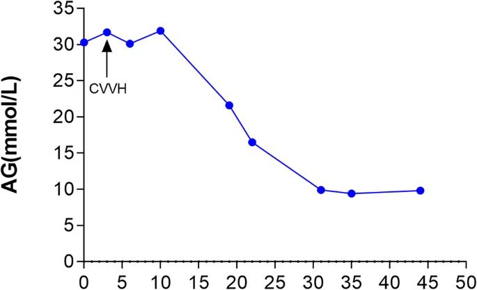 图3 患者转入ICU后44小时内动脉阴离子间隙(AG)的变化。在开始连续静脉-静脉血液透析滤过(CVVH)后,患者的代谢性酸中毒迅速改善。箭头表示CVVH的启动时间
