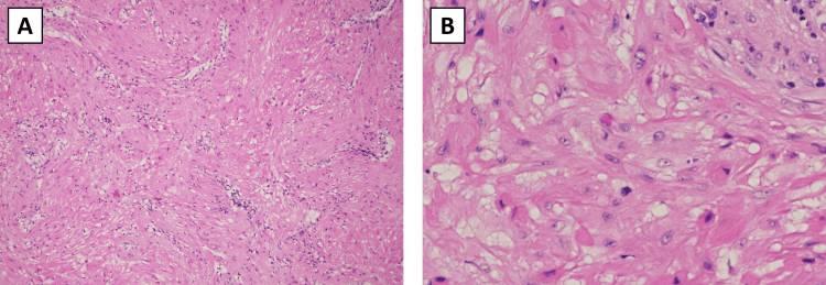 图1 平滑肌瘤的H&E染色。肿瘤显示(A)螺旋状和(B)纺锤形、“雪茄形”核,末端钝
