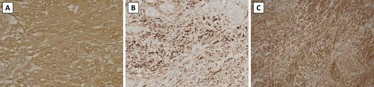 图2 平滑肌瘤的免疫组织化学染色呈阳性。(A) 平滑肌肌动蛋白染色;(B)结蛋白染色;(C)钙调结合蛋白染色