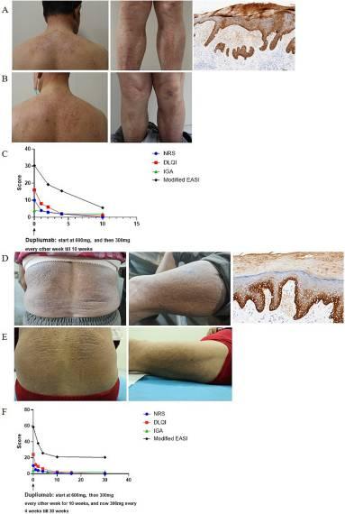 一名69岁的女性,因3年全身性皮疹伴严重瘙痒就诊于皮肤科诊所(NRS:10;IGA:4;DLQI:24;m-EASI:58.4)。体检发现躯干和四肢上分布着红色丘疹和斑块(图1D)。她的个人和家族史无明显异常。实验室检查均在正常范围内。腿部皮肤活检显示真皮乳头上有角化过度、角化不良、棘皮病和嗜酸性物质沉积;嗜酸性细胞沉积免疫组织化学CK5/6呈阳性(图1D),支持LA的诊断。在光疗、局部皮质类固醇和口服抗组胺药失败后,于2023年12月27日开始了一个疗程的dupilumab治疗,该疗程以600 mg作为负荷剂量,然后每两周注射300 mg,持续10周,随后每月注射300 mg。1周后瘙痒缓解,2周后皮肤病变改善(图1E)。在治疗期间,所有评分持续下降(30周时NRS:0;IGA:2;DLQI:0;m-EASI:20.4)(图1F),无不良反应。