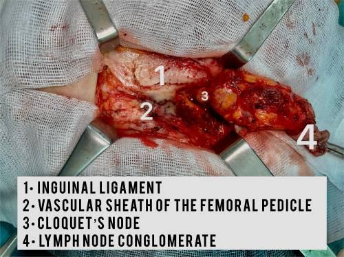 在识别出浅表淋巴结后,切除前仔细结扎其血管蒂。解剖继续进行到Cloquet淋巴结,对淋巴结进行了完整的整体切除(图2)。使用腹股沟韧带和耻骨筋膜之间的加强U型缝线实现了区域闭合。