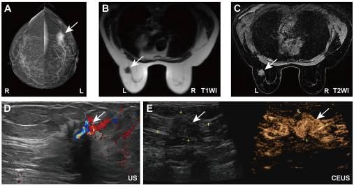 图1 患者的术前影像学数据。(A)乳房X线摄影。(B)T1和(C)T2加权乳腺磁共振成像。(D)彩色多普勒超声和(E)手术治疗前患者的乳腺超声造影。白色箭头表示肿瘤的位置。CEUS,超声造影