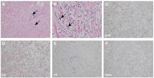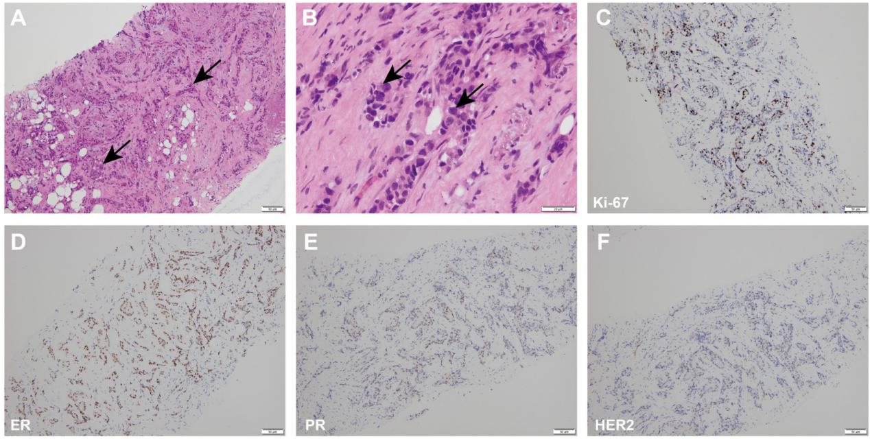 图S1。左乳房穿刺活检标本的病理检查结果。H&E染色,放大倍数为(A)x100(比例尺,50μm)和(B)x400(比例尺,20μm)。黑色箭头表示肿瘤细胞。左乳腺穿刺活检标本中的IHC(C)Ki-67(放大倍数,x400;比例尺,50μm)、(D)ER(放大倍率,x400,比例尺,50微米)、(E)PR(放大倍数,x400;比例尺,50μm)、(F)HER2(放大倍数,x400;比例尺,50μm)。免疫组织化学;ER,雌激素受体;PR,孕激素受体;HER2,人表皮生长因子受体2