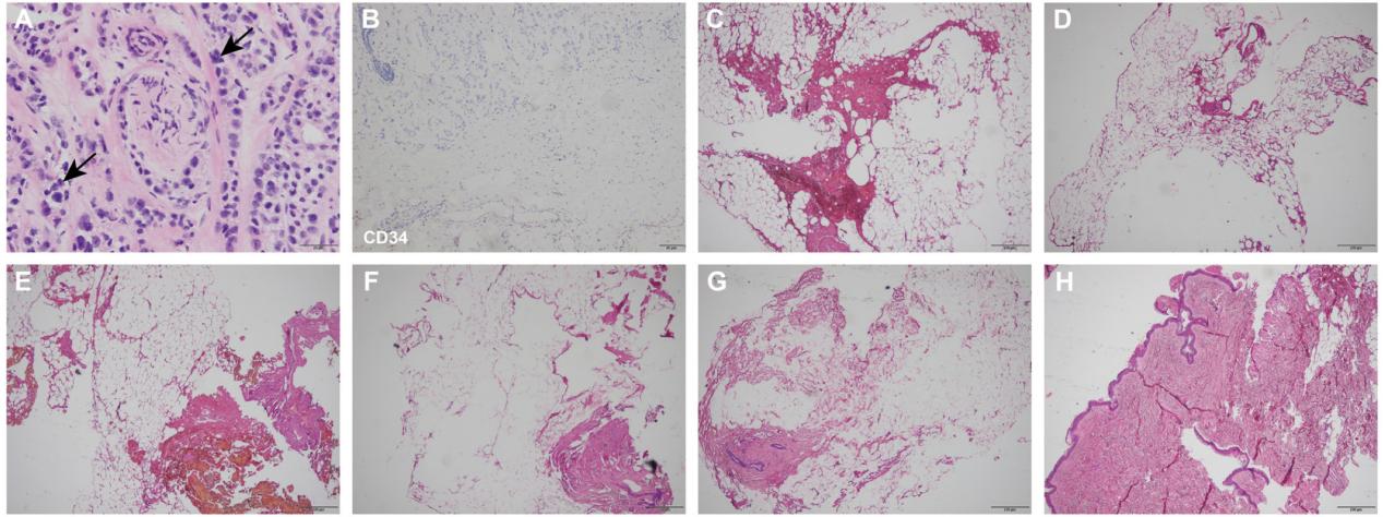 图S2 术后乳腺组织的组织学发现。(A)H&E染色显示肿瘤细胞对神经的侵袭(黑色箭头;放大倍数x400;比例尺20μm)。(B)CD34的IHC显示肿瘤微环境中没有淋巴血管浸润的证据(放大倍数,x400;比例尺,50μm)。H&E染色显示在多个方向确认的阴性手术切缘:(C)12点钟,(D)3点钟,(E)6点钟,(F)9点钟,(G)基底(深)和(H)浅(皮肤),在任何切缘都没有观察到残留的肿瘤细胞(放大倍数,x20;比例尺,200μm)