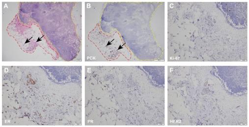 图3 左腋窝前哨淋巴结和脂肪组织的病理检查结果。(A)放大20倍的H&E染色(比例尺,200µm)。左腋窝前哨淋巴结和脂肪组织中的(B)PCK(放大倍数,×40;比例尺,200µm)、(C)Ki-67(放大倍数:×100;比例尺,50µm),(D)ER(放大倍数:×100;比例尺,50µm)、(E)PR(放大倍数:×100;比例尺,50µm)和(F)HER2(放大倍率:×100,比例尺,50μm)。黄色虚线框表示左腋窝前哨淋巴结,红色虚线框表示与左腋窝前哨淋巴细胞相邻的脂肪组织(转移性病变)。黑色箭头表示肿瘤细胞。PCK,细胞角蛋白;ER,雌激素受体;PR,孕激素受体;HER2,人表皮生长因子受体2