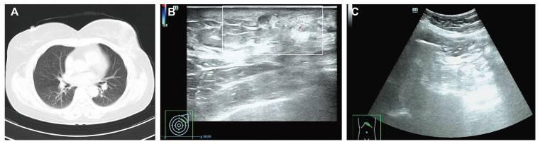 图4 患者的放射学随访成像。(A)胸部计算机断层扫描显示没有肺或纵隔转移的证据。(B)乳房超声检查显示左乳房术后变化,无局部复发迹象。(C)腹部超声检查显示无肝脏或腹膜异常