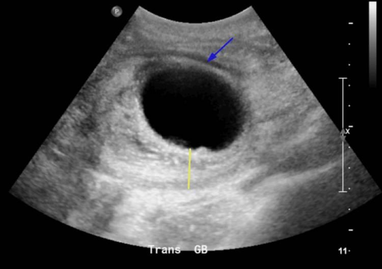 胆囊横断面超声显示胆囊明显增大,壁增厚(黄线),并注意到胆囊周围积液(蓝色箭头),与出血性胆囊炎一致。