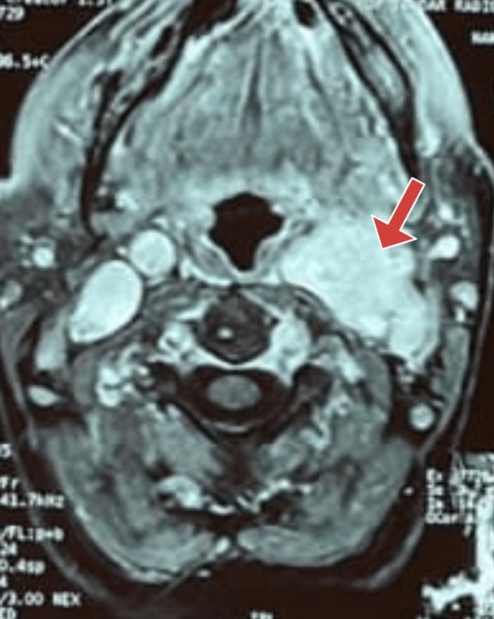 图1 颈部CT扫描显示左颈动脉分叉处有一个软组织肿块(红色箭头)