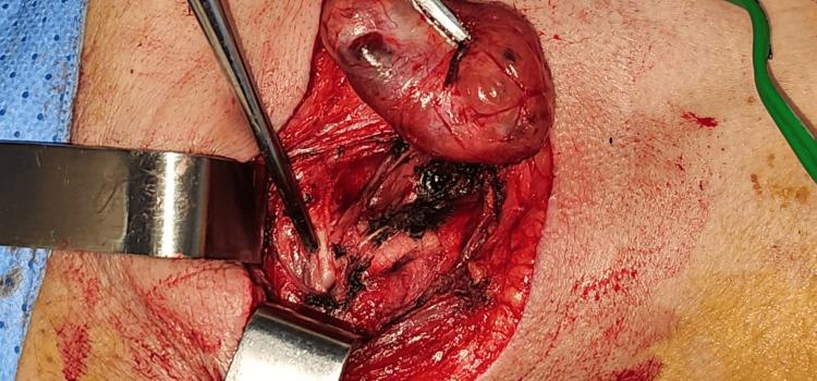 图2 术中拍摄的照片显示,在保留所有血管和神经的情况下,成功分离了肿块