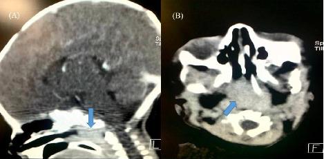 随着紫绀性呼吸暂停发作的持续时间延长,患者接受了气管插管,过程中未见肿块。据患儿母亲描述,紫绀性呼吸暂停发作通常发生在哭闹之后。心脏评估未发现异常。支气管镜检查发现后鼻孔变窄(图1)。考虑后鼻孔肿物或后鼻孔闭锁、气道软化。经过CT扫描发现鼻咽区域增强,不排除血管瘤、皮样囊肿、淋巴管瘤和畸胎瘤等肿块(见图2)。