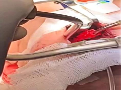 肿物测量值为24 × 25 毫米,颅底没有骨缺损,考虑血管瘤。查体见患儿口内肿物突出,排除其他部位血管瘤后行支气管镜检查显示悬雍垂全长肿块(图3)。经口入路切开软腭后发现以鼻咽区为中心的血管肿块,延伸到口咽,位于悬雍垂后(图4)。在图5中,肿块被经口取出,彻底切除肿块和悬雍垂,并烧灼止血,闭合软腭。患者继续插管5天后,第6天出现鼻腔及口腔大出血,考虑气管插管创伤引起。2天后支气管镜检查未见并发症,予以拔管。随后进行泼尼松龙治疗6个月,联合制霉菌素滴剂和普萘洛尔。患者出院并完全康复,没有出现进一步的并发症。
