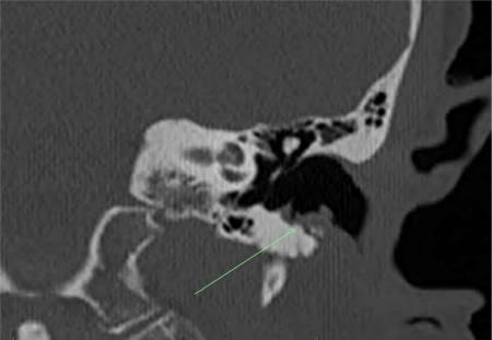 图1 病例A—左耳道冠状位CT扫描,箭头显示下耳道侵蚀区域,上覆分叶状软组织