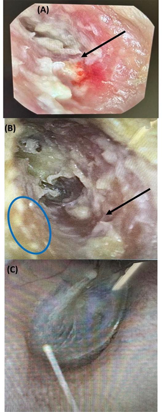 图3 病例B的耳道耳镜图像。(A)单抗治疗时的左外耳道:鼓膜位于内侧,被碎片、皮肤缺损和骨裸露所遮挡(黑色箭头)。(B)利塞膦酸钠治疗后6个月的左外耳道:骨缺损减少(黑色箭头)上方的早期上皮化(蓝色圆圈)。(C)右外耳道正常