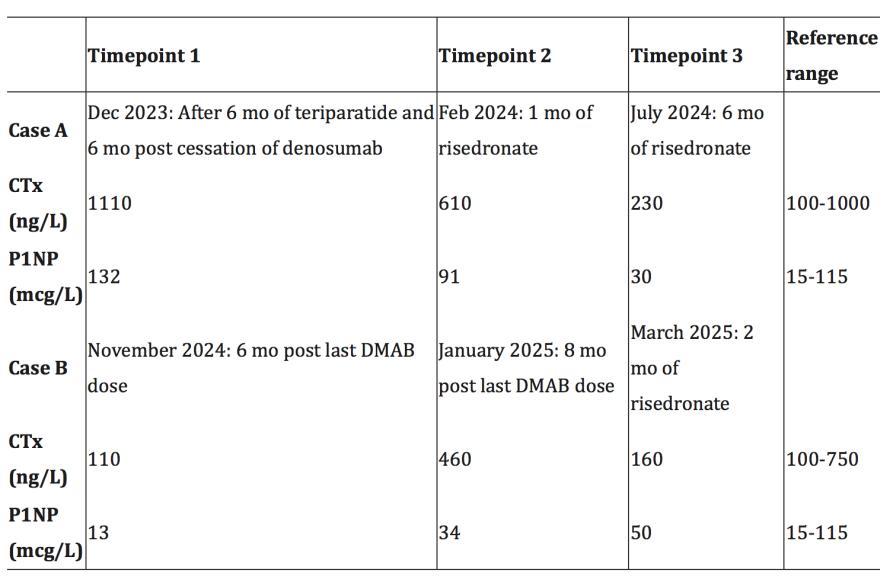 根据外耳道骨坏死的诊断,2023年6月停止使用最后一剂地诺单抗,并于当月开始每天皮下注射20mcg特立帕肽。患者出现了短暂的高钙血症,校正钙为2.75mmol/L(参考范围:2.10-2.60 mmol/L),当时没有服用钙补充剂。此外,2023年11月,出现了多发性症状性双侧草酸钙肾结石,需要支架治疗。由于患者担心高钙血症和肾结石,2023年12月停用特立帕肽。患者不愿意继续以当前剂量或降低剂量频率服用特立帕肽。