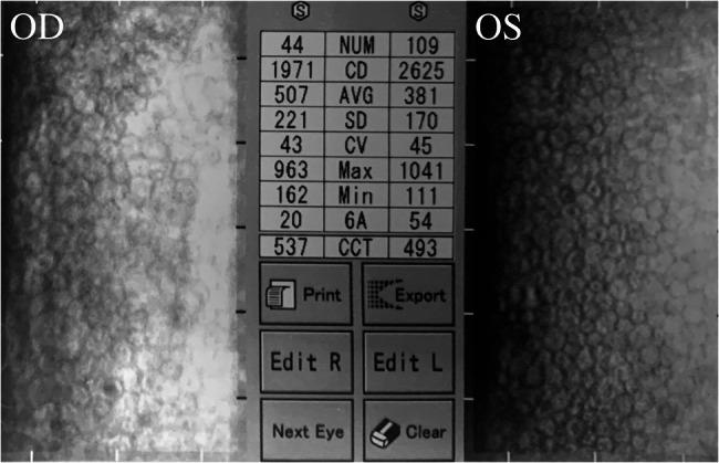 图2 镜面显微镜显示,与左眼相比,右眼内皮细胞轻度肿胀(马拉松后2周)。角膜中央厚度测量显示,与左眼(493μm)相比,右眼(537μm)的厚度增加