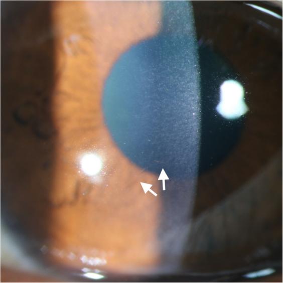 图3 角膜水肿和表面染色接近完全消退,角膜下段内皮水平持续存在1mm丝状瘢痕(白色箭头)(马拉松后3周)