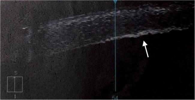 图4 OCT扫描显示内皮丝状瘢痕为高信号强度增厚的焦点区域(白色箭头)(马拉松后3周)