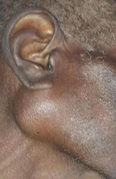 一位50岁的男性患者主诉右耳下肿胀逐渐加重,偶尔轻度疼痛,持续三年。没有相关的感觉异常或运动缺陷。既往无头颈部癌症手术史,否认发烧、发冷、盗汗、食欲变化和体重减轻等不适,无饮酒、吸烟史。