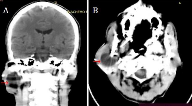 图2 CT扫描显示右侧腮腺囊性病变(红色箭头)