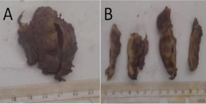图3 大体图:边界清晰的囊性组织(A)和切面(B)