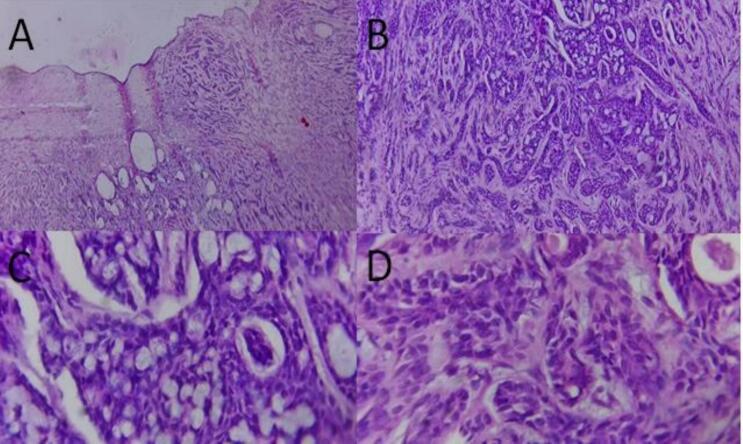 图4 组织切片显示囊壁内衬双层立方细胞(a,10×)。壁被中等多形性、深染、成角的基底样细胞浸润,这些细胞排列成坚固的巢状(D,40×)和筛状图案(B,20×和C,40×,苏木精和伊红)