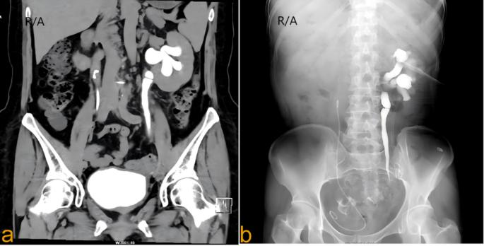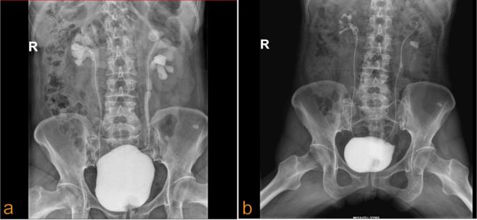 术后第一年和第二年分别进行了输尿管镜检查,结果被归类为Clavien-Dindo 1级。为了防止随后的狭窄,在这些手术中更换了输尿管支架。相应的SCR水平分别为115µmol/L和130µmol/L。肾彩色多普勒超声显示无肾盂积水。逆行膀胱造影显示左输尿管通畅,无造影剂外渗(图4a,b)。
