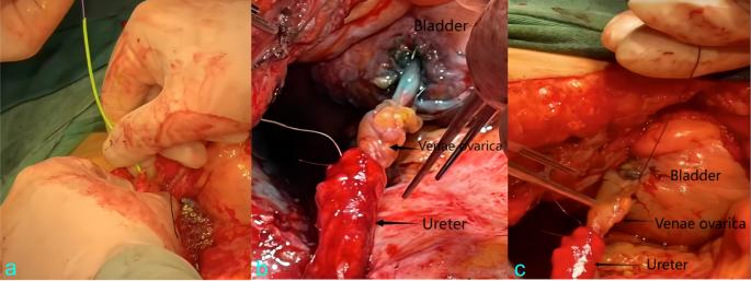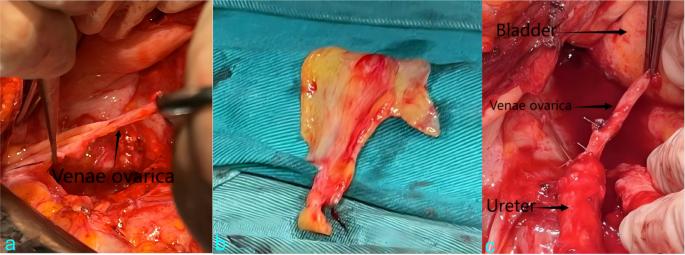 为了测试吻合口的完整性,通过导尿管注射了200毫升含茜素蓝的生理盐水,吻合口处没有观察到泄漏(图3b)。卵巢静脉和吻合口用周围的脂肪和腹膜组织加固,为防止吻合口裂开或缺血性坏死(图3c)。