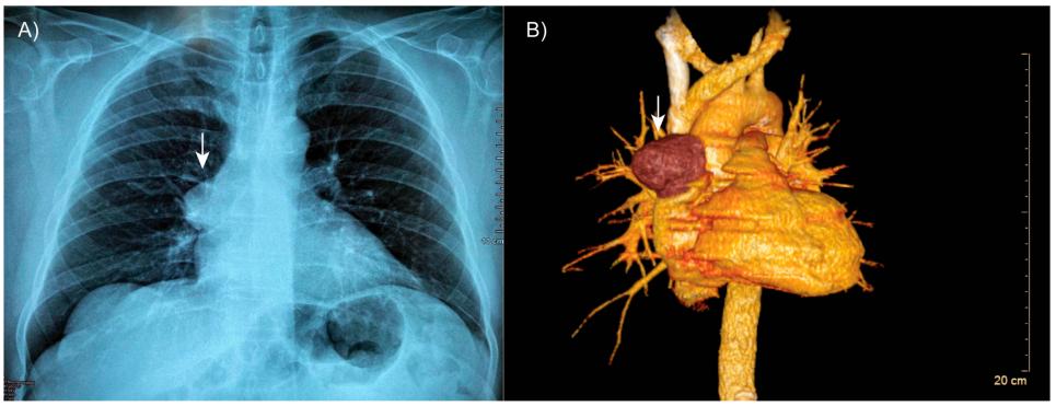 图1 患者的断层扫描。(A)胸部计算机断层扫描显示右前上纵隔内有一个明确的包膜肿块(箭头)。(B)三维重建显示病变(箭头)非常靠近邻近的血管结构,没有侵入的证据