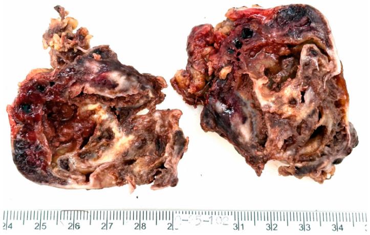 图2:切除肿物的宏观外观。肿块呈多囊状,有白色至棕色的纤维隔膜,内表面呈细粒状,内容物出血。外囊看起来完好无损