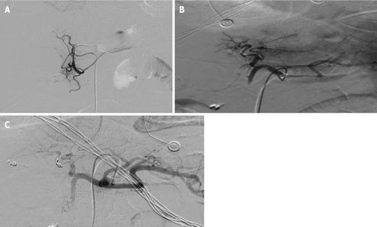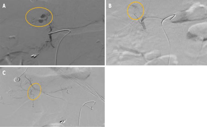 图3 出血点消失。A:介入栓塞后,胃十二指肠动脉小分支的出血点消失;B:介入栓塞后,供应肝左叶的胃十二指肠动脉小动脉分支的出血点消失;C:介入栓塞后,与左肝动脉吻合的右肝动脉小动脉分支的出血点消失