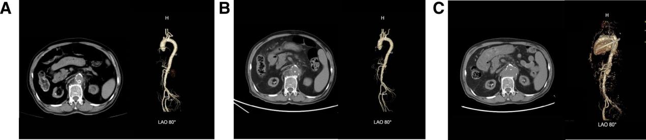 图1 计算机断层扫描血管造影(CTA)系列影像显示主动脉溃疡进展过程:(A)2024 年 10 月 10 日 CTA,可见主动脉局部溃疡,伴主动脉周围渗出;(B)2024 年 10 月 22 日复查 CTA,溃疡进展为穿透性,直径由 5 mm 扩大至 11 mm,炎症反应加重;(C)2025 年 1 月 2 日复查 CTA,考虑腹主动脉多发穿透性溃疡,伴周围巨大血肿形成,较前次影像学检查呈显著进展