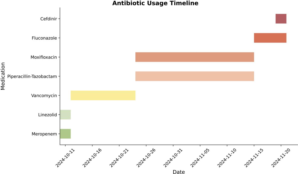 患者初始诊断为脓毒症、尿毒症和高钾血症,并开始广谱抗生素治疗:美罗培南0.5g每12小时静脉注射,联合利奈唑胺0.6g每12小时口服。在血培养鉴定出甲氧西林敏感金黄色葡萄球菌(MSSA)后,调整为万古霉素 0.5g 静脉滴注,每 8 小时 1 次。尽管炎症标志物初期有所改善,但约2周后的随访计算机断层扫描血管成像显示腹主动脉溃疡进展,伴周围渗出性改变(图1B)。抗生素方案随后调整为哌拉西林-他唑巴坦4.5g每12小时静脉注射,联合莫西沙星0.4g每日口服。整个病程中抗生素使用的时间线如图2所示。